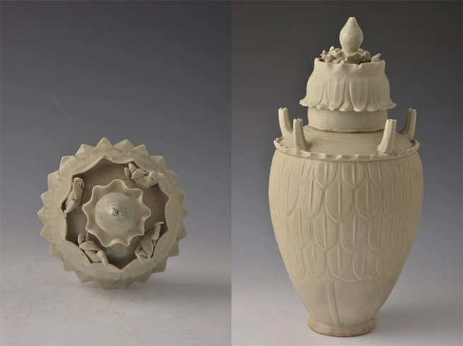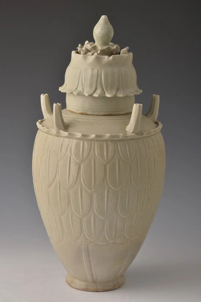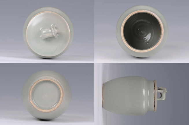该器周身饰蕉叶纹,釉色晶莹,盖为覆莲纹,盖顶作四鸭戏水,形态生动。迄今为止,在被发现的文物中,与该器物完全相同的造型的瓷器是绝无仅有的,因此,它对研究龙泉窑青瓷具有珍贵的实物资料作用。