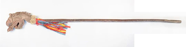 其中最引人注目也最能反映民族特色的就是畲族祖杖,原始祖杖存量很少,景宁县畲族博物馆的清畲族龙首木祖杖是极为珍贵的畲族族宝。长212×龙首宽25cm,头部雕成龙首状,口含龙珠,龙须龙鳞雕刻线条流畅,双目烔烔有神。下部呈圆柱形。龙首漆暗红色油漆,杖身漆桐油。龙头与手持棒衔接处雕刻祥云纹,并系数红色布条,一张布条代表一个学师的人,父学师,子系父之下,孙学师,系于子之下,希望得到始祖的庇护。