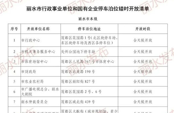 丽水行政事业单位和国企停车位向社会开放详见《丽水市行政事业单位和国有企业停车泊位错时开放清单》。2020-07-02