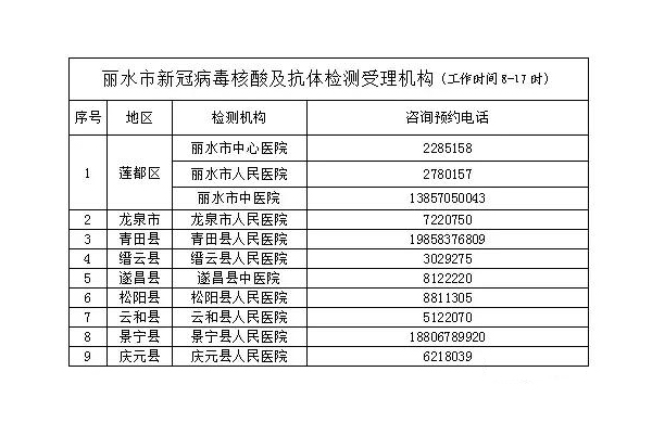 丽水九县市区单位或个人可自费核酸检测了丽水九县市区的单位或个人可自愿自费进行核酸检测了,检测定点医院和联系电话如下:2020-05-11