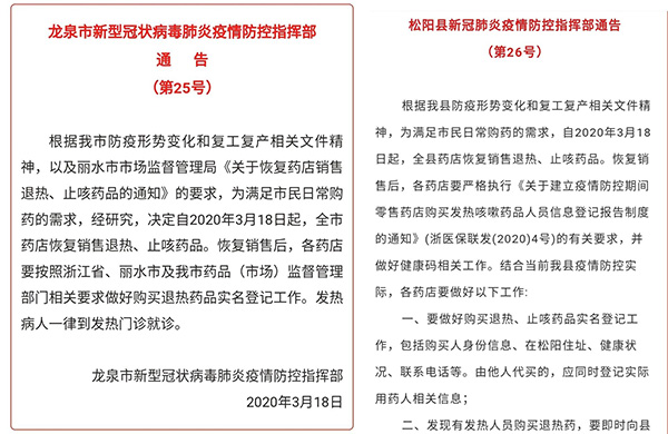 3月18日起,龙泉松阳恢复退热止咳药销售2020年3月18日起,各药店恢复销售退热、止咳药品。恢复销售后要做好购买退热药品实名登记工作。发热病人一律...2020-03-19