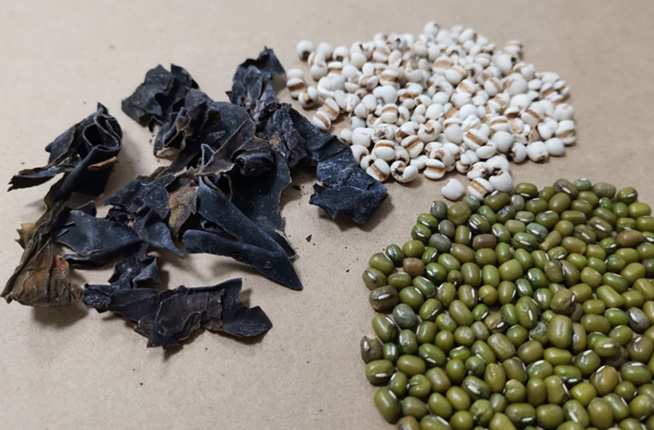 原料:绿豆150克,海带、薏仁各60克,冰糖适量。