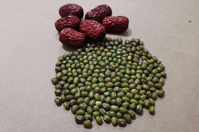 做法:绿豆洗净,加清水浸泡2至3小时,捞出放入锅内,加水1000 毫升煮沸后改用小火煮至绿豆熟烂,备用。红枣洗净,放入锅中,加水500毫升煮沸后,改小火煮至枣熟,备用。白糖放入锅中,加水100毫升,煮沸,待糖化后将绿豆、红枣、糖桂花放入调匀,煮沸即可。待凉后分次食用。