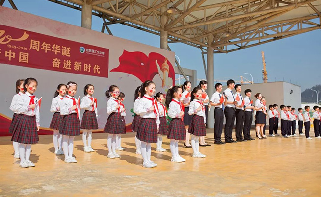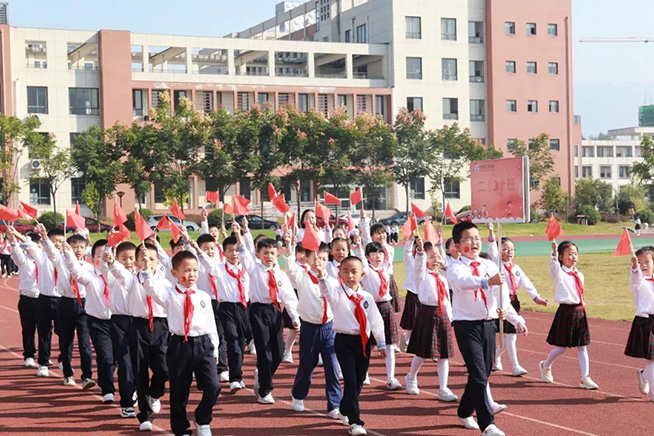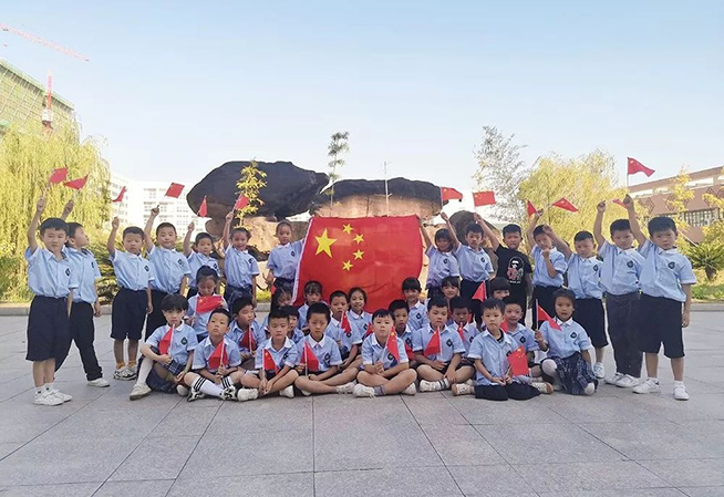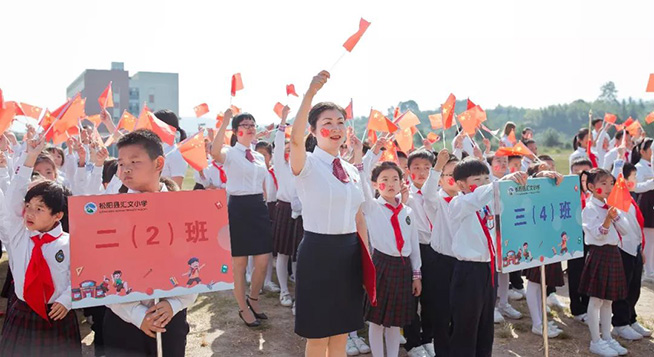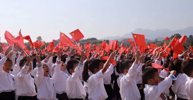 五星红旗迎风飘扬,胜利歌声多么响亮,歌唱我们亲爱的祖国,从今走向繁荣富强……"全体师生手挥国旗,齐声歌唱,气势高昂的歌声响彻整个校园!