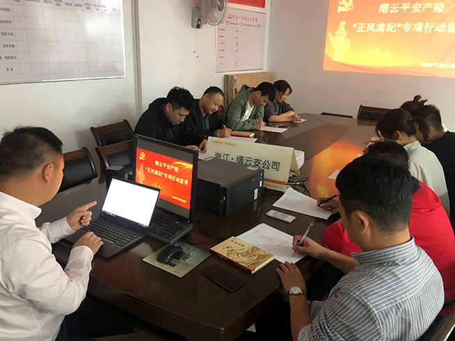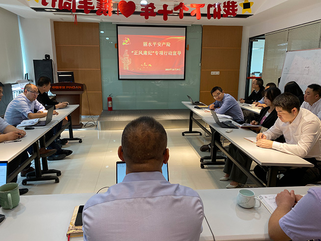 为进一步加强公司党的建设,深化党风廉政建设,弘扬正气、凝聚士气,加速推进“正风肃纪”专项行动各项工作在公司全面展开, 10月24日,丽水平安产险召开“正风肃纪”专项行动宣导会议,成立领导小组和执行小组,就行动的具体内容和要求向各机构、渠道、部门进行动员及部署。