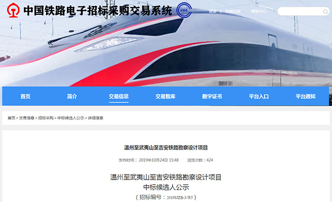 近日,温州至武夷山至吉安铁路勘察设计项目(招标编号:2019SJZB-3-WJ)的招标评标工作已经结束,评标委员会经评审推荐了本项目中标候选人。
