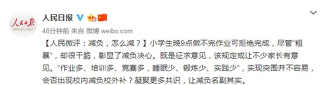 《减负方案》在网上引发热议,人民日报评:小学生晚9点做不完作业可拒绝完成,尽管“粗暴”,却很干脆,彰显了减负决心。既是征求意见,该规定或让不少家长有意见。“作业多、培训多、竞赛多,睡眠少、锻炼少、实践少”,实现突围并不容易,会否出现校内减负校外补?凝聚更多共识,让减负名副其实。