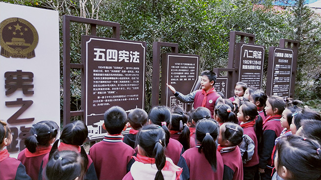 宪法法治文化园以景色宜人的凤凰山为载体,通过尊宪篇、崇法篇、尚德篇、警心篇、公正篇、典故篇、法治篇等七个板块演绎,以浮雕墙、景观小品、主题雕塑、艺术场景多形式的设计手法,将宪法法治精神、法治文化元素、传统法律典故等内容与公园山水景色充分融入,寓教于游,寓教于景,让游人在休闲娱乐过程中潜移默化接受法治教育。