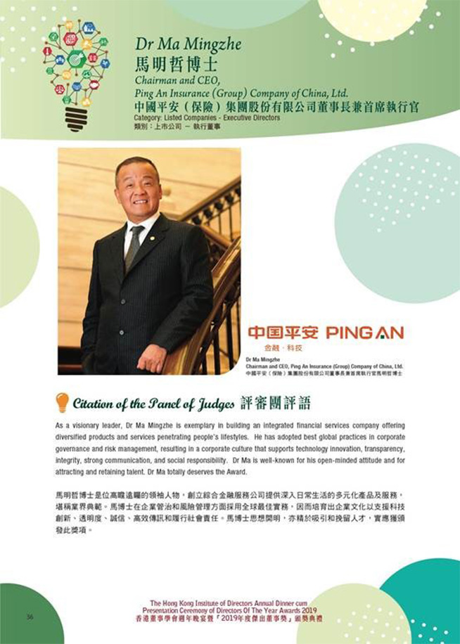 评审团同时高度评价马明哲博士在企业管治和风险管理方面采用全球最佳实务,因而培育出企业文化以支援科技创新、透明度、诚信、高效传讯和履行社会责任。”