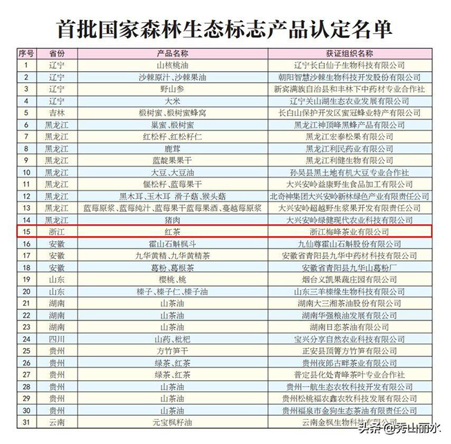 本月初(12月3日),第四届全国林业产业大会在北京召开。会议公布了第四届中国林业产业突出贡献奖和创新奖、第四批国家林业重点龙头企业、新一批国家林业产业示范园区、首批试认定的森林生态标志产品名单。位于丽水市的农业林业龙头企业“浙江梅峰茶业公司”生产的“红茶”,被认定位全国“首批森林生态标志产品”,是浙江省唯一入选林业企业。