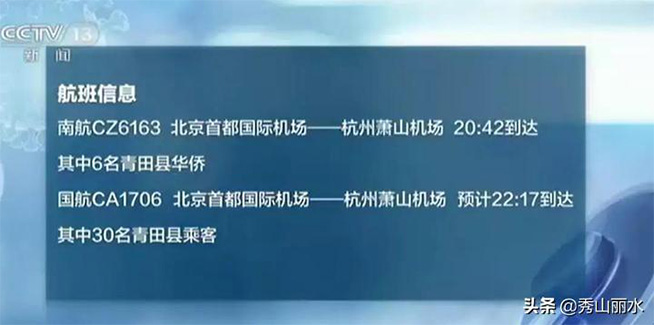 第一架航班南航CZ6163:从北京首都国际机场到杭州萧山机场,其中6名青田县华侨,经疾控部门检测未发现有发烧、咳嗽等症状,已由青田县政府派专车接走,进行隔离观察。机上其他乘客,纳入地方管控。