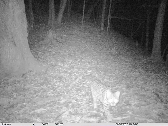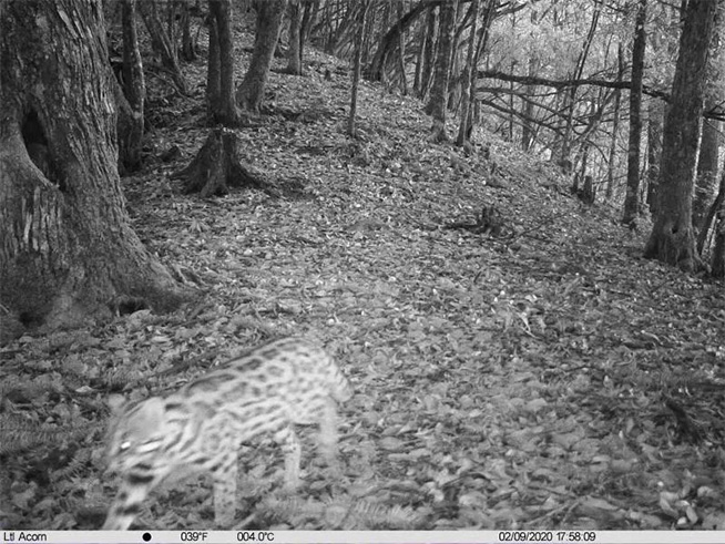 近日,浙江九龙山国家级自然保护区管理中心工作人员在查看搜集回来的红外相机监测数据时发现,布设在考坑防火林带的一台红外相机,居然拍摄到了豹猫的身影,而且还是两次,分别为2020年2月9日17点58分和2020年2月20日20点19分。