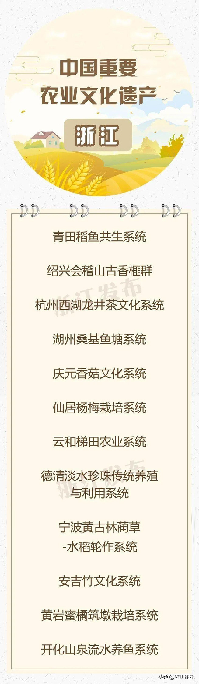 近日,农业农村部公布了第五批中国重要农业文化遗产名单,全国共27项,其中浙江12项,丽水市与湖州市分别占3项,并例全省第一。