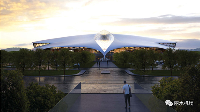 目前航站楼已基本完成报批方案设计,“飞鸟”造型吸收了丽水地方人文和风景特色,依山就势,景物融合。