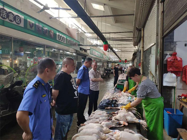 执法人员发现有部分“杀白上市”交易点,鸡、鸭等禽类动物未按照要求佩戴脚环标识,执法人员要求经营者立即停止交易活动,县市场监督管理局对未佩戴脚环标识的禽类进行扣押并查处。
