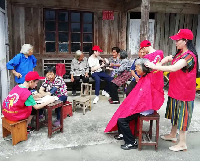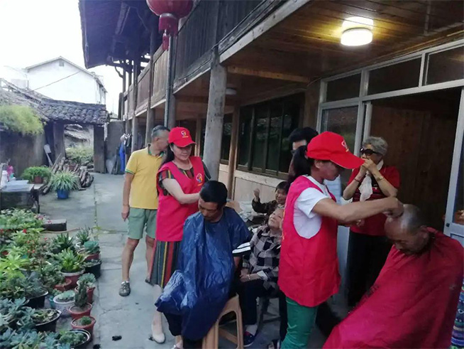 叶海英一直任劳任怨地照顾自己残疾的婆婆,还自发组建了景宁红十字会大漈茶林志愿服务队和大漈乡茶林村巾帼爱心服务团队。他们为敬老院老人提供免费理发及其它力所能及的服务,也积极为大漈各个偏僻自然村里不方便的老人提供免费理发、量血压、剪指甲等日常的生活服务。