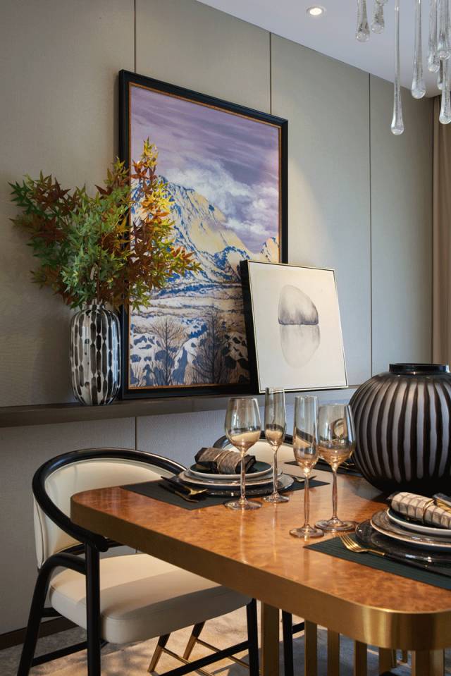 新中式,当下时代的追捧。珍创将东方的丰富细腻用现代设计诠释,将形态美和空间美转化成一种无声的设计语言,让主人充分感知和享受意境氛围。生活的情趣在餐厅的挂画、花艺绿植、摆件,组合中,意趣盎然。