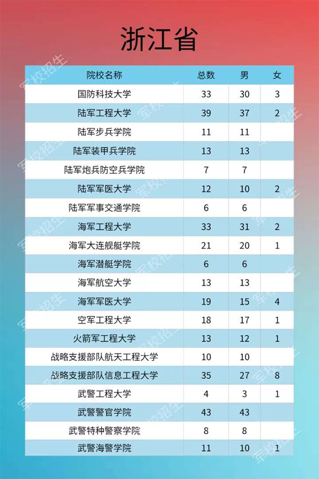 今年20所军队院校在浙江招生计划共355人,其中男生329人、女生26人。这些院校是:国防科技大学、陆军工程大学、陆军步兵学院、陆军装甲兵学院、陆军炮兵防空兵学院、陆军军事交通学院、陆军军医大学、海军工程大学、海军潜艇学院、海军大连舰艇学院、海军航空大学、海军军医大学、空军工程大学、火箭军工程大学、战略支援部队航天工程大学、战略支援部队信息工程大学、武警工程大学、武警警官学院、武警特种警察学院、武警海警学院。