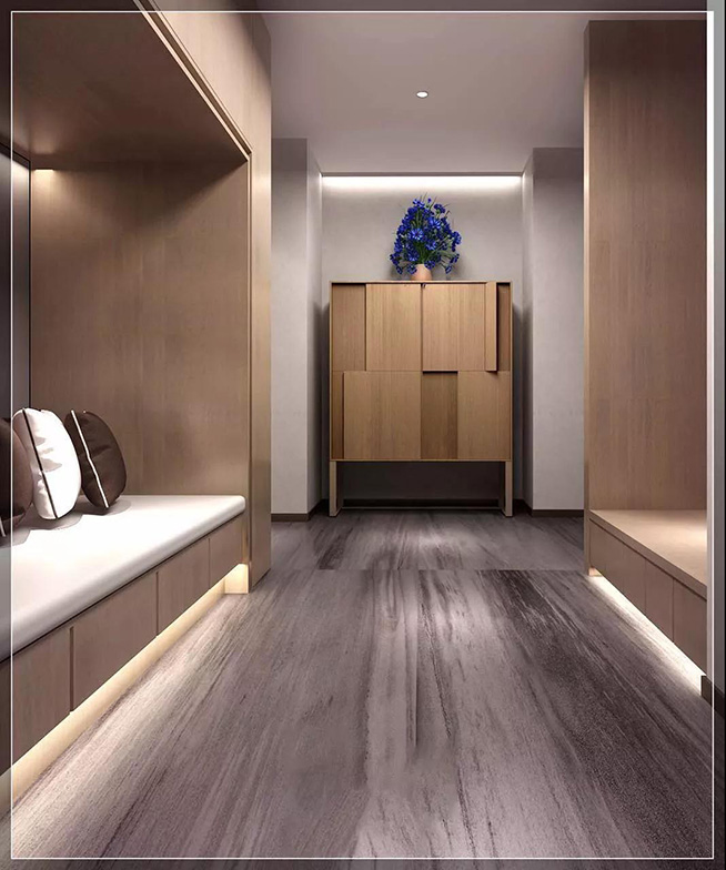入户玄关,映入眼帘的原木色家具纹理细腻、精致,给人一种自然、返璞归真的感觉;同色系抱枕的搭配则营造了更为温润而又舒适的居家生活,体现的是自然的生活情怀。原木柜上一簇紫色牵牛花是点睛之笔,在柔和的灯光下一缕暗香淡淡散开。