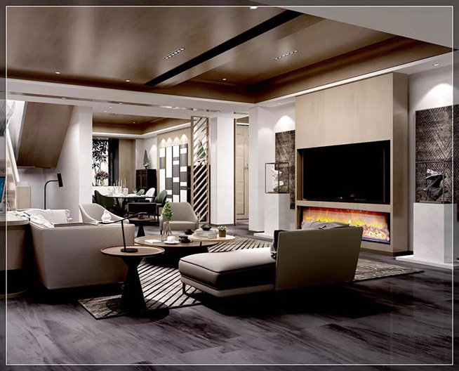 电视柜下方的壁炉为“画龙点睛”,为整个冷色调的空间增加了暖意,它不仅传热效果快,而且健康环保。在寒风凛冽的冬日,一家人围坐在温暖的客厅,看看电视,聊聊天,时间仿佛就此定格。
