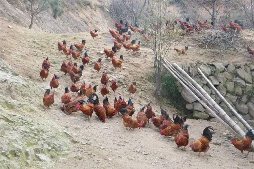 而后,栾少波又带我们到了后山的百亩中草药基地,他双手打着拍子一赶,毛色黄亮、红冠黑尾的鸡群便成群结队从树上、坡上、林中飞奔而来,四处乱窜,鸡声“咯咯咯”此起彼伏,场面颇为壮观。