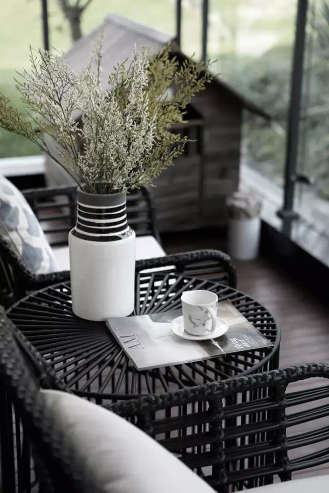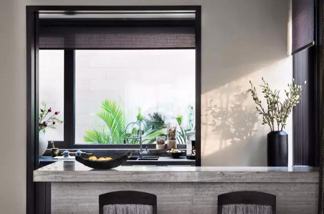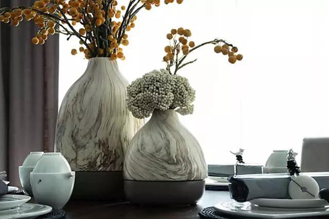 世间万物无不存在圆和方,它们都有自然独特、和谐的美。人们在认识这种美的过程中,从算术的加减法中获得灵感,将圆与圆、方与方、圆与方进行理性地组合,创造了这种美。大理石纹路的茶几、黑色典雅的柜子、饰品的摆件都运用黑色线条勾勒出矩形的方正,体现了一种凝聚力和感染力。