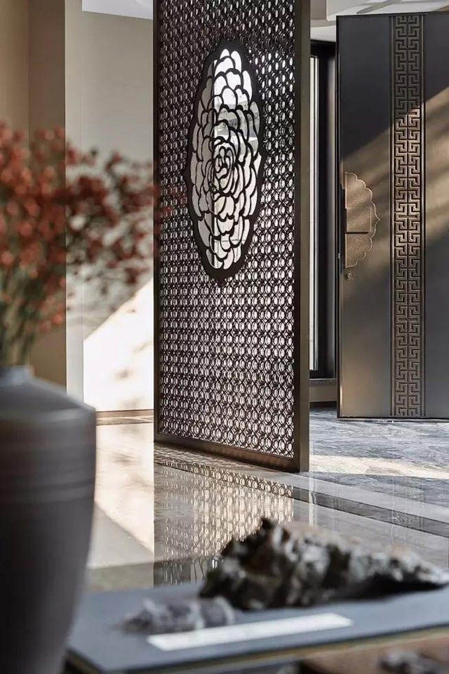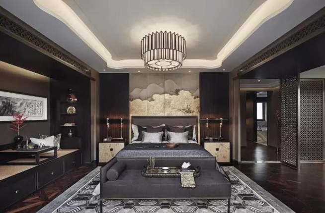 大面积的金箔画与静气内敛的深色系为主卧渲染基调,铜器的光泽穿插点缀,透过镂空的木质屏风,漏下了点点滴滴的夕阳余晖,映照在浓绿的枝叶,将卧室书写出了庭院的意趣。