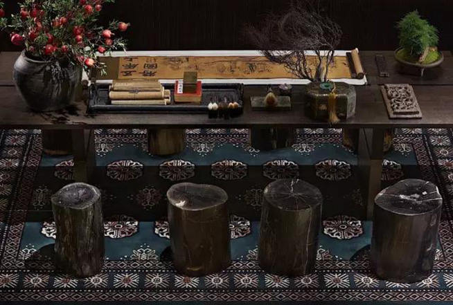 保留树木的纹理和形态,略加打磨,大小不一却更见情致。放置于古朴的地毯之上,仿佛从中生长出来一般。