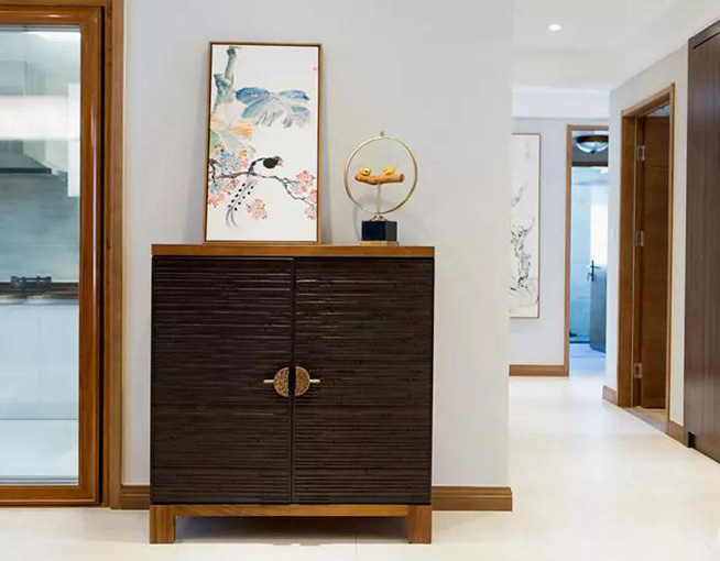 映入眼帘的深色竹语边柜散发着竹林静谧的气息,淡彩花鸟画缓缓展开。如梦如画,美丽、安静。