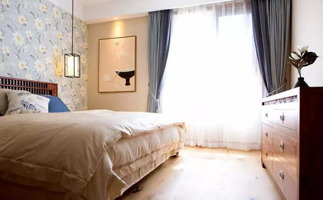 背景墙将肌理感运用到极致,与中国风床头灯相结合呈现安稳又多彩的时光。空间以蓝为基调,相同色系的深浅调和,又赋予空间丰富的层次美感。床细节处的雕刻,点燃东方元素的魅力。