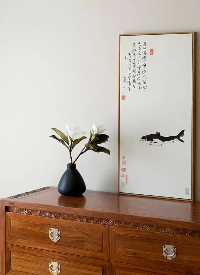 字画与整体空间和谐相融,点明主题。现代人的风雅和品位,在写意空间里尽显主人对中式文化的追求…