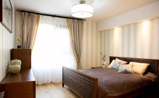主卧是一个既有现代舒适感,又富含中式禅意空间,主人休憩之室、唯静为上。整体采用对称的构图方式、稳重致静。细节则以小品式构图布景、以表主人的生活雅趣。