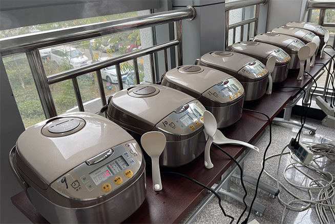 在现场,专家组首先对参与评比的稻米进行外观评比。随后,将10多个电饭煲围成一圈,刚蒸好的米饭,冒着呼呼的热气,米饭晶莹剔透,带着大米特有的清香,溢满整个房间。专家们分别对各煮熟的稻米进行品尝。