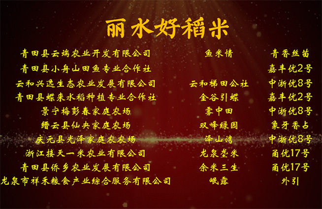 经过评委们的综合打分,最终评选出今年“丽水好稻米”前十名的金奖获得者。按照排名分别为:
