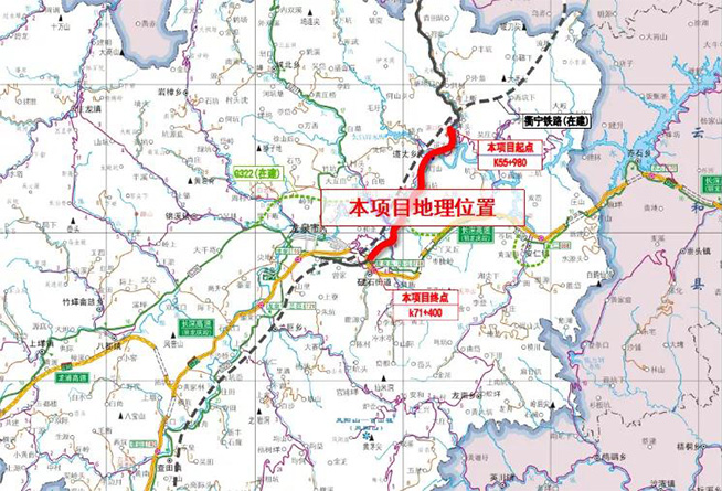 项目主线全长约15.120公里,另设小白岸连接线(0.374公里)与道太乡连接线(0.403公里),项目合计建设里程15.897公里。主线设桥梁大桥22座共4686.6米,中小桥5座共395米,隧道3座共1472米。另小白岸连接线设1座177.7米的大桥,道太乡连接线设1座347米的大桥;设置公路服务站1处。项目采用双向两车道二级公路技术标准设计,设计速度60公里/小时(其中起点至K59+307困难路段采用40公里/小时)。