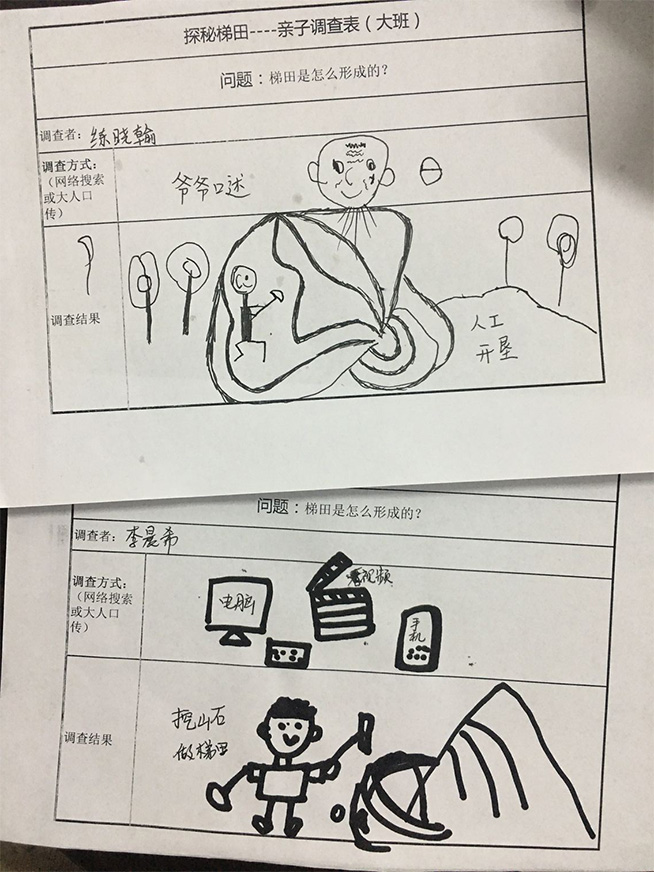 任务3:梯田形成的调查 老师设计了一张亲子调查表,在群里发布了一条关于“梯田是怎么形成”的亲子调查作业,幼儿们晚上回家就开始了调查,第二天,幼儿们带回了调查表,通过老人的口述和上网查到的资料,我们揭开了梯田的神秘的面纱:原来水稻的种植要大面积的水塘,但是云和的山不适合种植水稻,为了解决粮食问题,农民伯伯们开垦山地,构筑梯田,解决了当地的粮食生产问题。