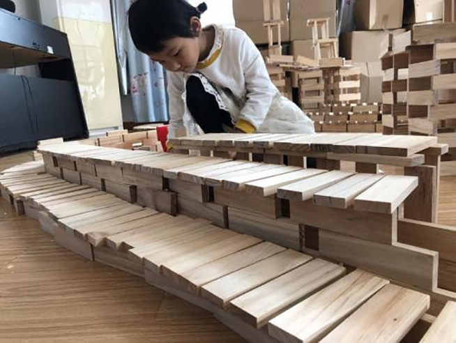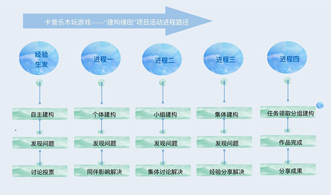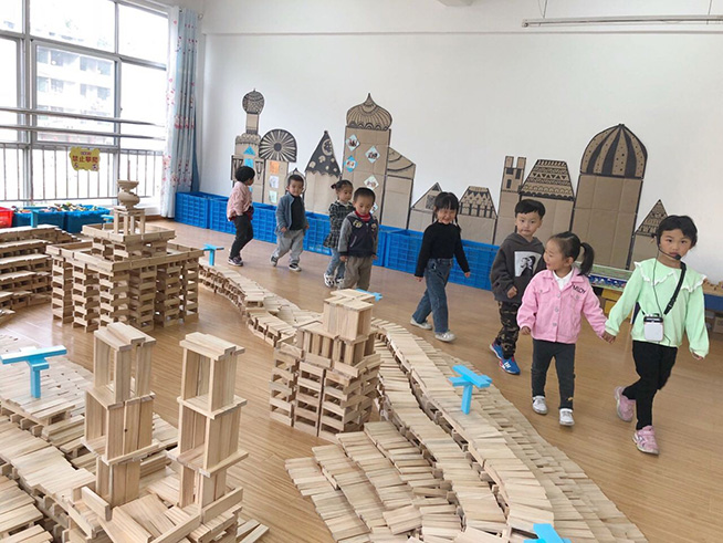 2:建构梯田 基于幼儿对建构梯田的极大兴趣,师幼借助卡普乐木玩游戏材料开启了建构梯田的项目化活动。游戏进程中观察是教师了解幼儿游戏情况的前提,幼儿的真实想法会在无意间流露,教师敏锐捕捉及时回应,一个肯定的眼神、一句鼓励的言语,是助推游戏热潮兴奋剂,在项目推进中,教师注重幼儿的充分自主,建构内容由浅入深,从易到难,建构方式从个体搭建、小组建构到集体合作;作品呈现由单个小作品到逐渐壮大的复杂工程,师幼在发现问题解决问题的过程中,从中学会了观察、思考、表达、创造、合作等等优秀的学习品质,作品分享中幼儿学会了勇敢的展现自己,收获的不仅是建构技能,更多的是从个体融入集体,从无到有的成功体验,相信这样的成长经历会深深的印烙在幼儿的内心,有助于塑造自信和大气的性格。教师在活动中的角色始终是观察并帮助幼儿发现问题,引导幼儿解决问题,如此循环至上地支持和助推着幼儿进行有深度的学习,“建构梯田”卡普乐项目活动让教师在游戏中的地位和幼儿的自主也更加有意义。