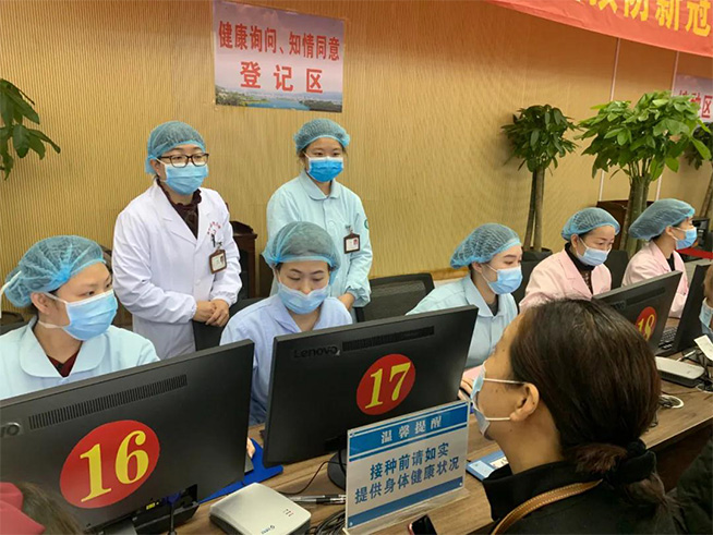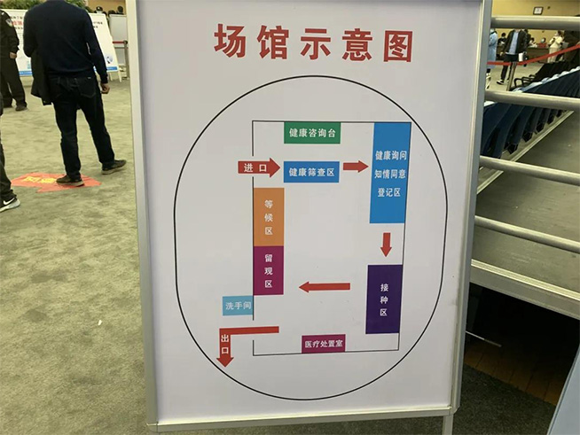 从入口处开始,一路有疫苗接种指示牌和工作人员指引:首先到健康询问知情同意登记区登记,再到接种区接种,接种完毕后取得预防接种凭证,再到留观区留观30分钟,没有身体不适方可离开。