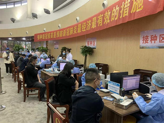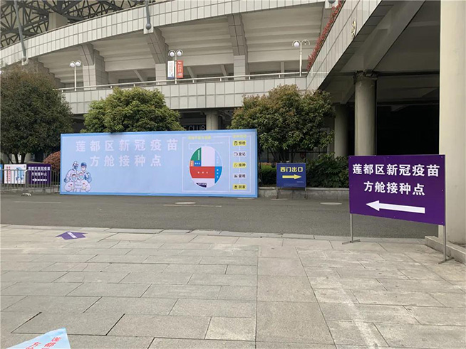 市民可以从体育中心紫金路上的东门进入,戴口罩、测体温、出示健康码即可进入接种点。