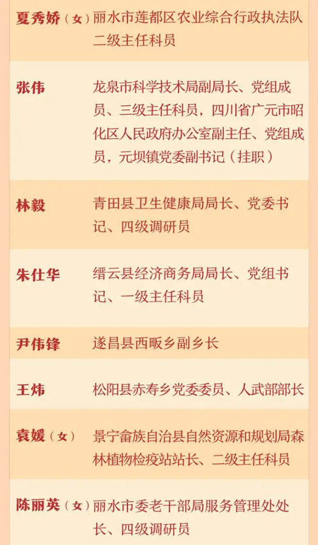 浙江“最美公务员”名单公布,丽水市共8人上榜!他(她)们是:夏秀娇、张伟、林毅、朱仕华、尹伟锋、王炜、袁媛、陈丽英。
