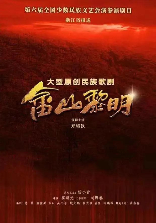 大型原创民族歌剧《畲山黎明》荣获“优秀剧目奖”,北京、内蒙古、西藏、浙江,共计4家院团获此殊荣;剧中4位主要演员:郑培钦、薛雷、陈盼盼、满添,荣获“艺术表演奖”。