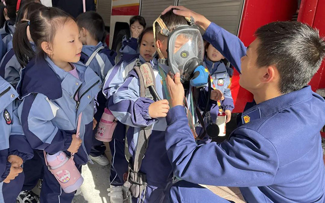 消防员叔叔生动形象地向大家介绍了消防车辆和一些随车器材装备。