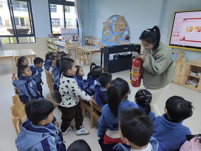 活动后,小朋友们来到走廊、操场等位置寻找身边的消防器材。看!灭火器和消防水管在这扇门里,花坛里一排排站着的是大消防栓......