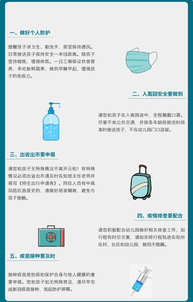 鉴于我省三地确诊多例新冠肺炎病例,伴随着秋冬季流感、疱疹性咽峡炎、手足口病、诺如病毒等传染病高发期,我们面临的疫情防控形势非常严峻。常态化疫情防控需要大家的坚持和配合,在幼儿园切实做好新冠肺炎疫情防控工作的同时,希望家长能积极配合,做好常态化疫情个人防护。
