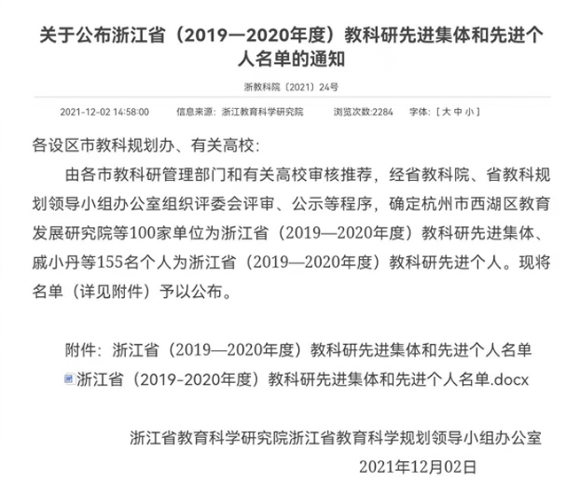 设为首页近日,浙江省教育科学研究院发布了浙江省(2019—2020年度)“教科研先进集体和先进个人”的公示名单,经专家评审,全省共有100个单位获奖,松阳县职业中等专业学校也是第二次获此殊荣。