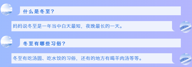 关于冬至,孩子们有许许多多的好奇:冬至在哪一天?冬至是做什么的?冬至吃什么?......等等,引发了集体大讨论。