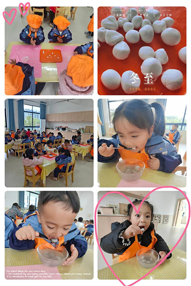为了让幼儿了解中华民族的传统习俗,培养幼儿的动手能力,也让孩子们感受到冬日里特有的快乐与幸福。2021年12月21日,云和县城东幼儿园开展了各种各样不同的冬至节主题活动,让孩子们感受冬日别样的爱与温暖!