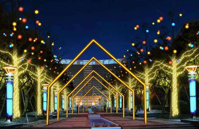 处州公园南北轴线两侧是“光辉之路”主题,将火车站广场拱形门装置移到此处,营造光辉之路,让市民、游客感受光辉岁月,体现大气开放;树上设置灯串和彩球灯烘托节日氛围,同时也寓意喜庆迎春,迎接美好的新年。水景采用小功率线条洗墙灯,凸显丽水的山水人文之情。
