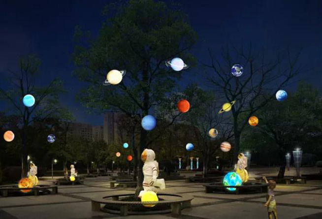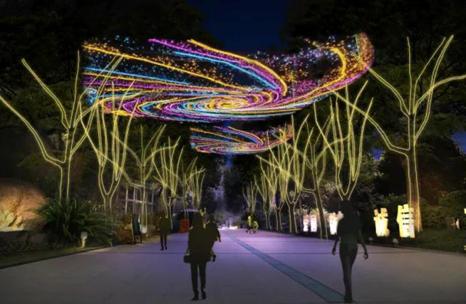 处州公园东、西主入口是“宇宙风云”主题,用七彩灯串营造宇宙星系,表达宇宙的无穷以及人类探索未知的精神。