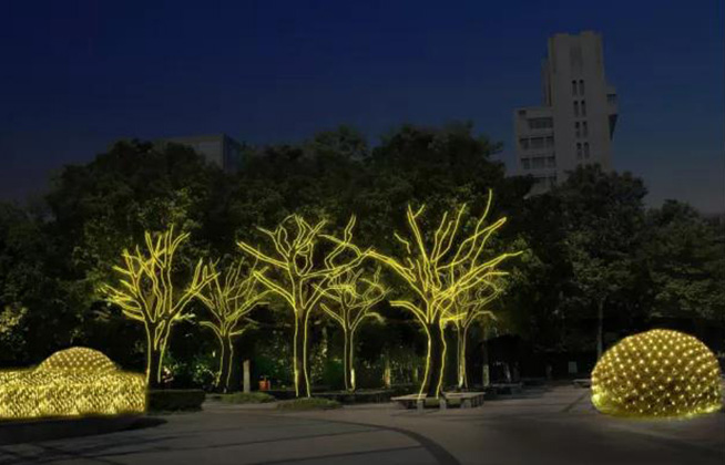 公园中间音乐喷泉旁边是“火树银花”主体,树木挂满天星形灯饰,灌木用网灯,营造节日气氛